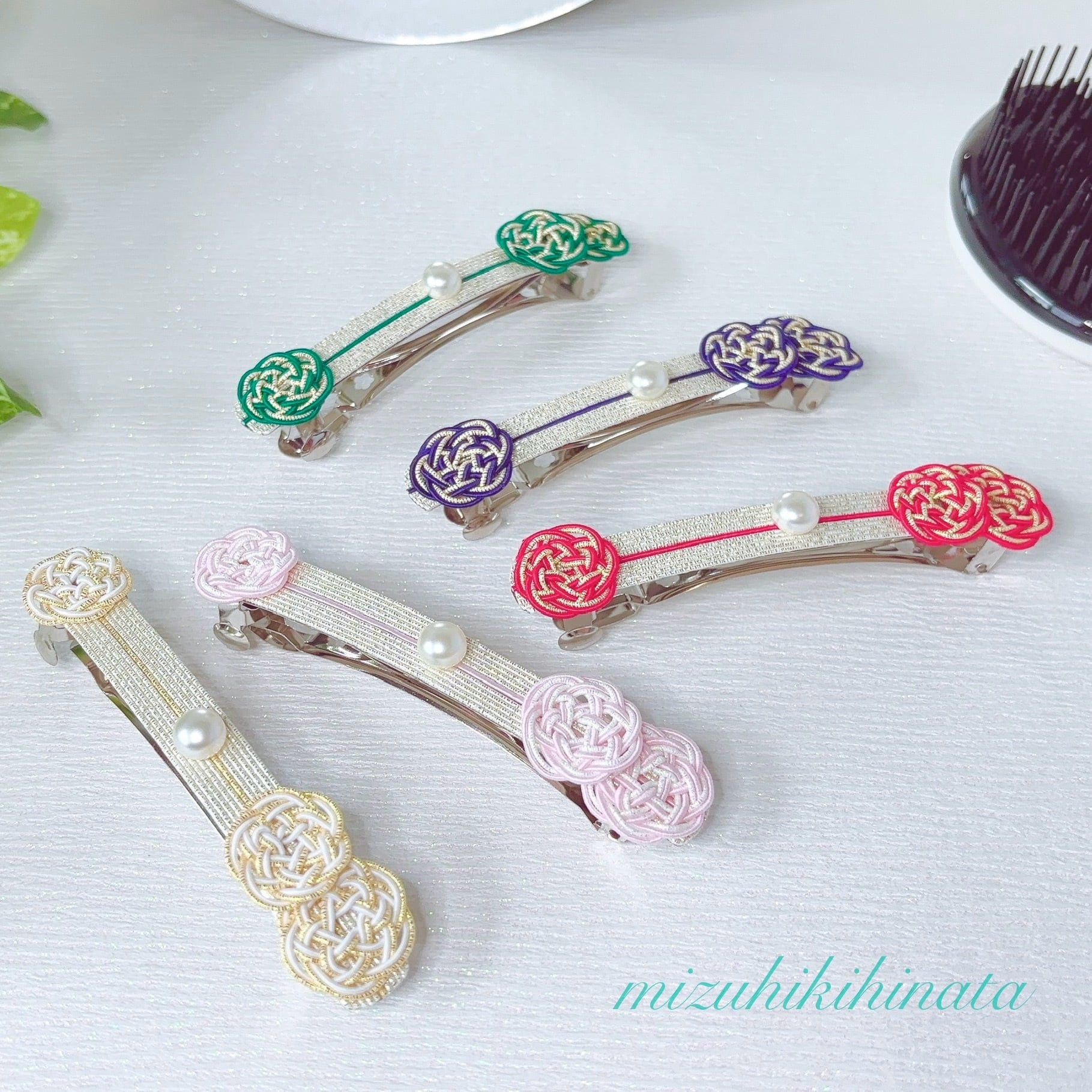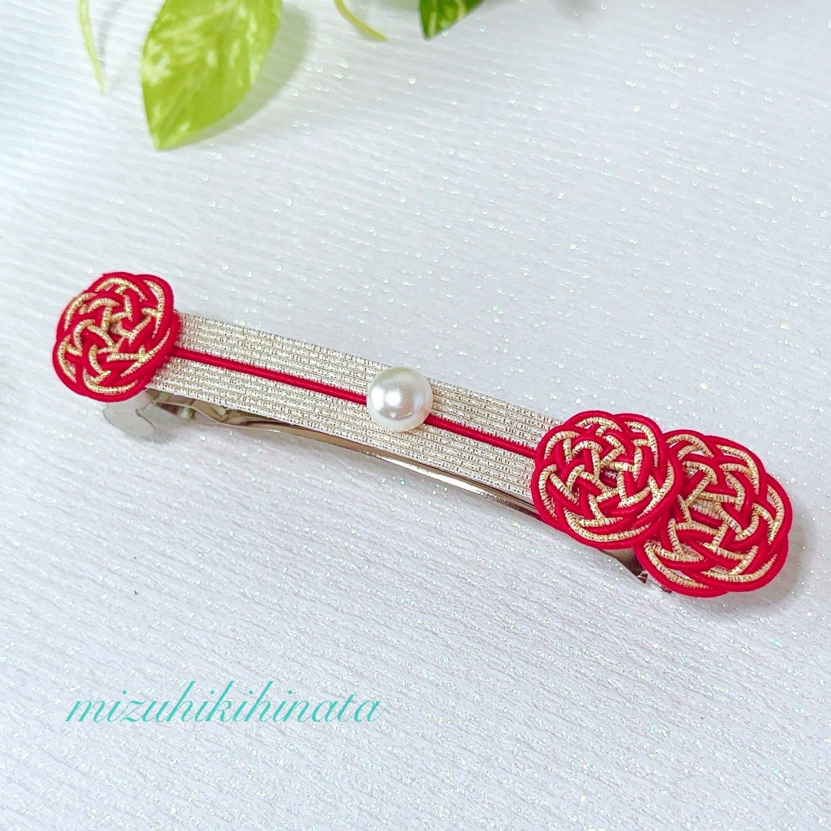 そこに柔らかな光を添えた水引バレッタは、伝統とモダンが響き合う特別な一品です。