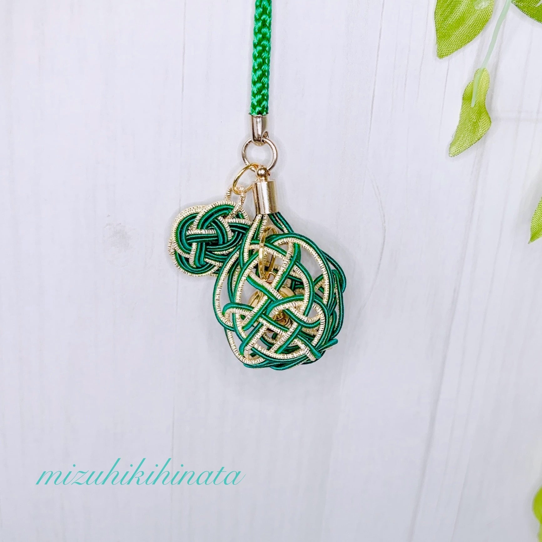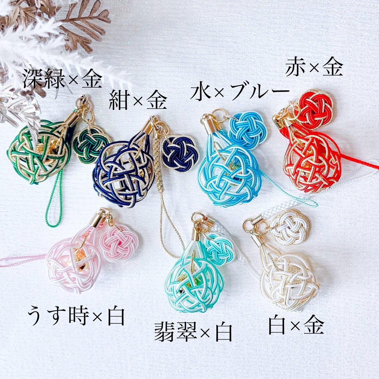 縁起の良い「亀結び」をアレンジし、ぷっくりとした小さなポーチのように仕立てた水引ストラップです。
